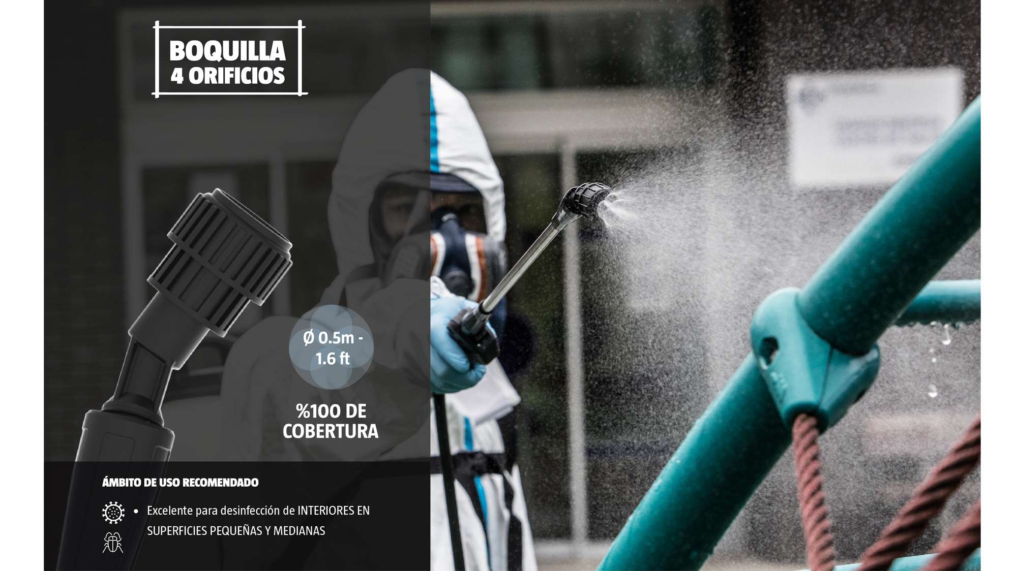 - 4 boquillas especiales en kit transportable de alta calidad para optimizar la eficiencia de los tratamientos en diferentes áreas de trabajo